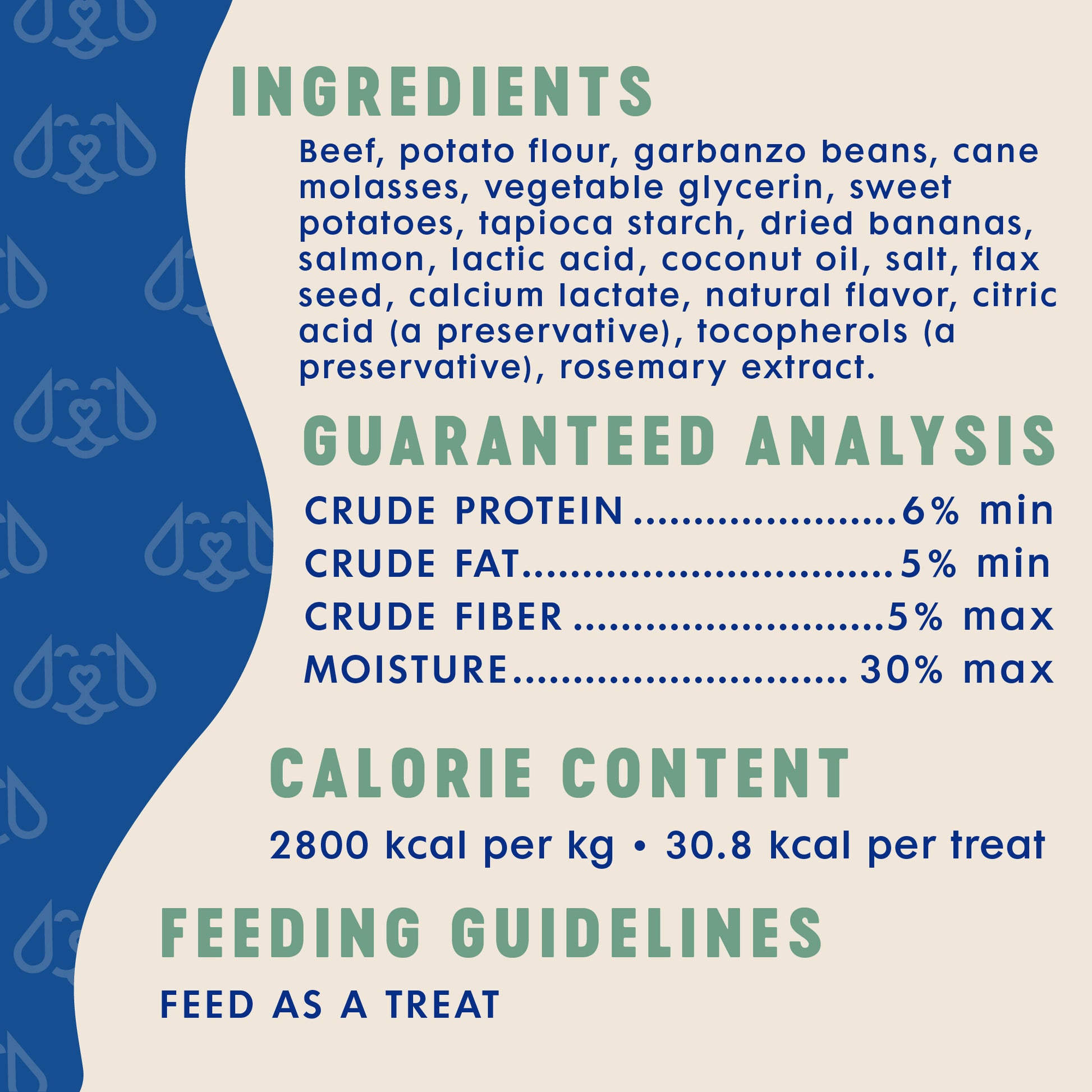 Calorie Content – Metabolizable Energy (calculated): 2,800 kcals per kg, 30.8 kcals per treat.